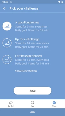Pick your personal challenge for standing at your desk and improve your health and work habits over time. Choose between 3 challenges (or create your own) and follow your progress on your smartphone through elaborate statistics. Let the app remind you when to stand.
