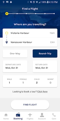Book a Harbour Air flight from your phone! Users will be able to make reservations and manage upcoming flights from their fingertips. The app will allow users to change or cancel flights depending on fare type booked and save your credit card details for quick purchases. User will also be able to add flight information to their calendar after completing a reservation.