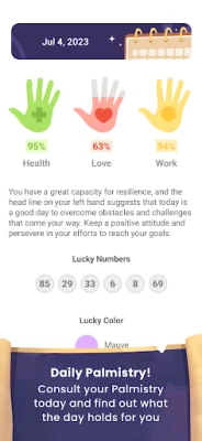 Not only do we provide a completely free, traditional palm reading, but we also track the daily changes in your palm lines. What does today have in store for you? Discover your daily levels of love, health, wealth, and work, as well as your lucky number and color for the day.