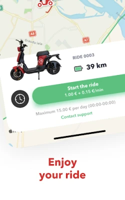 Find the nearest e-Bike on the map displayed on our App. Make sure that the battery is charged sufficiently for your planned ride. Go after the e-Bike. You can reserve the ride for 3 minutes.